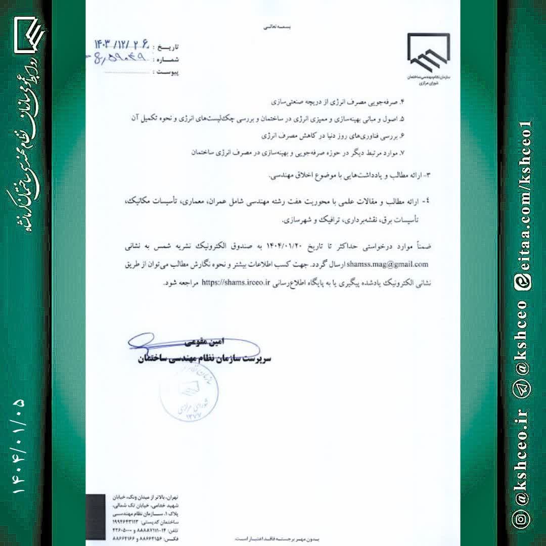 مکاتبه سرپرست سازمان نظام مهندسی ساختمان کشور با موضوع ارسال مقالات و مطالب اعضای محترم جهت انتشار شماره ۱۲۸ نشریه شمس