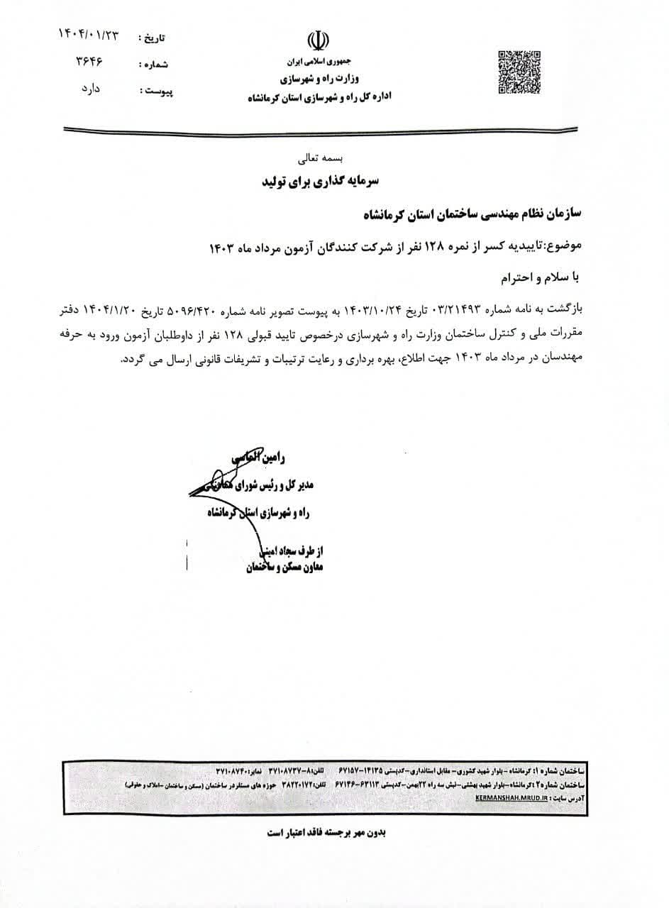 مکاتبه مدیرکل دفتر مقررات ملی و کنترل ساختمان و ابلاغ مدیرکل راه و شهرسازی استان در خصوص تاییدیه کسر از نمره ۱۲۸ نفر از شرکت کنندگان آزمون ورود به حرفه مردادماه ۱۴۰۳