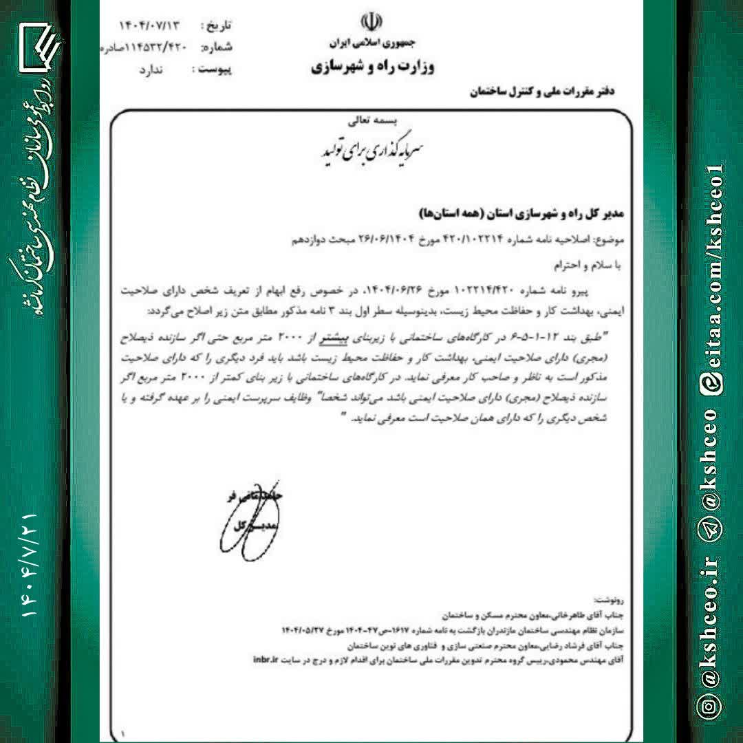 مکاتبه مدیرکل راه و شهرسازی استان و ابلاغ مدیرکل دفتر مقررات ملی و کنترل ساختمان با موضوع : رفع ابهام از تعریف شخص ذیصلاح ایمنی ، بهداشت کار و حفاظت محیط زیست ( سرپرست ایمنی )