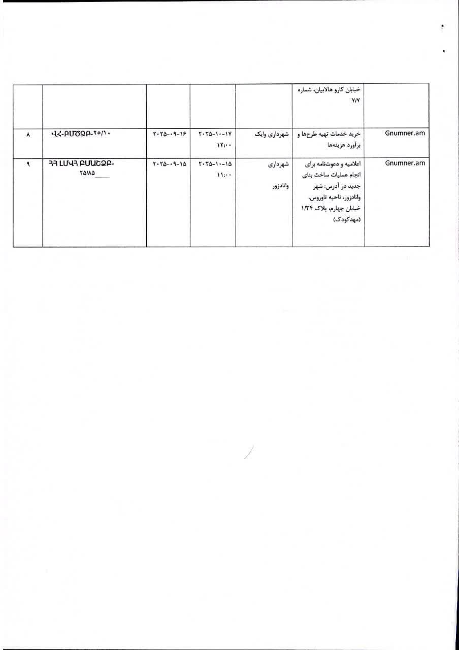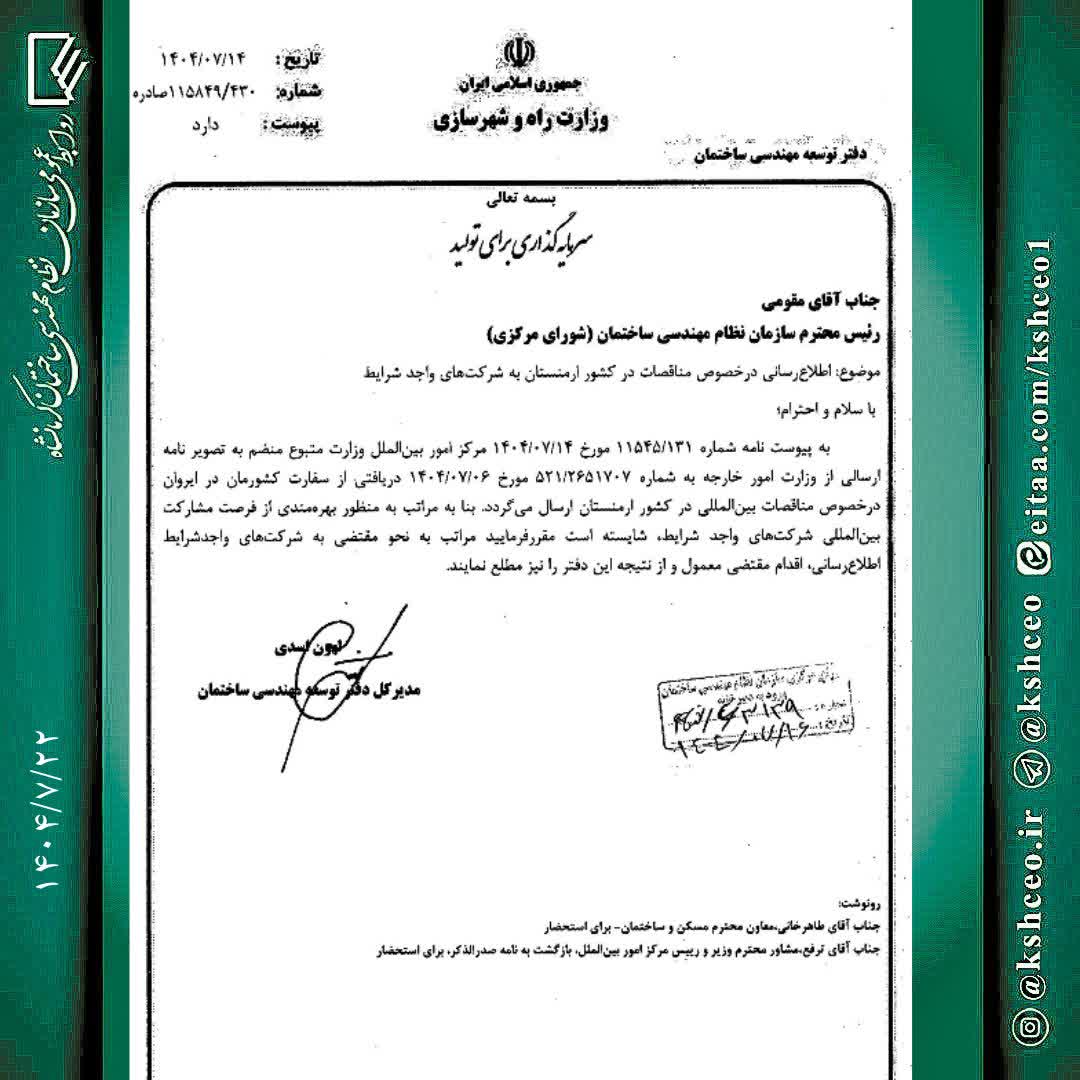 مکاتبه رئیس سازمان نظام مهندسی ساختمان کشور با موضوع اطلاع رسانی به افراد و شرکت های توانمند جهت مشارکت در مناقصه کشور ارمنستان