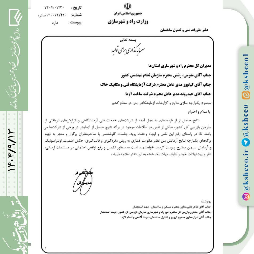 مکاتبه مدیرکل دفتر مقررات ملی و کنترل ساختمان با موضوع یکسان سازی نتایج و گزارشات آزمایشگاهی بتن در سراسر کشور