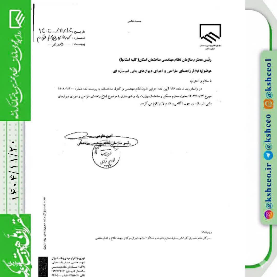 مکاتبه رئیس سازمان نظام مهندسی ساختمان کشور با موضوع ابلاغ راهنمای طراحی و اجرای دیوارهای بنایی غیر سازه ای