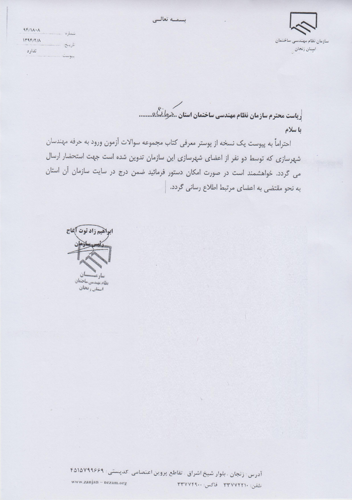 1394/02/24 10:23 تعداد بازدید:7306 معرفی کتاب مجموعه سوالات آزمون ورود به حرفه شهرسازی نویسنده : روابط عمومی
