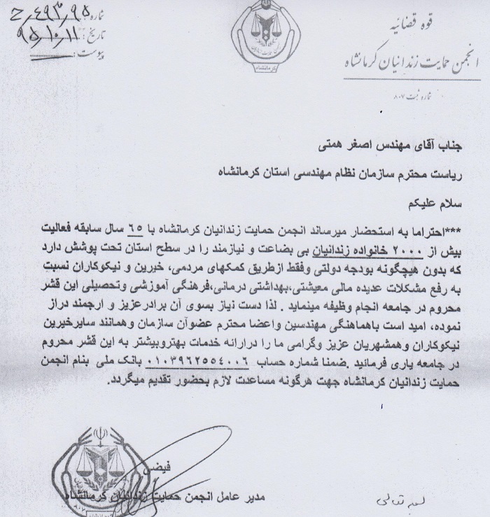 1395/10/19 14:22 تعداد بازدید:3055 نامه انجمن حمایت زندانیان کرمانشاه به سازمان نویسنده : روابط عمومی