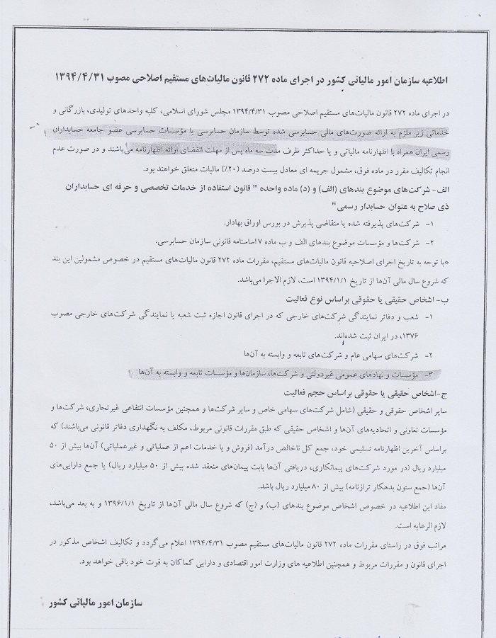 1395/10/25 14:15 تعداد بازدید:2803 اطلاعیه سازمان امور مالیاتی کشور در اجرای ماده 272 نویسنده : روابط عمومی