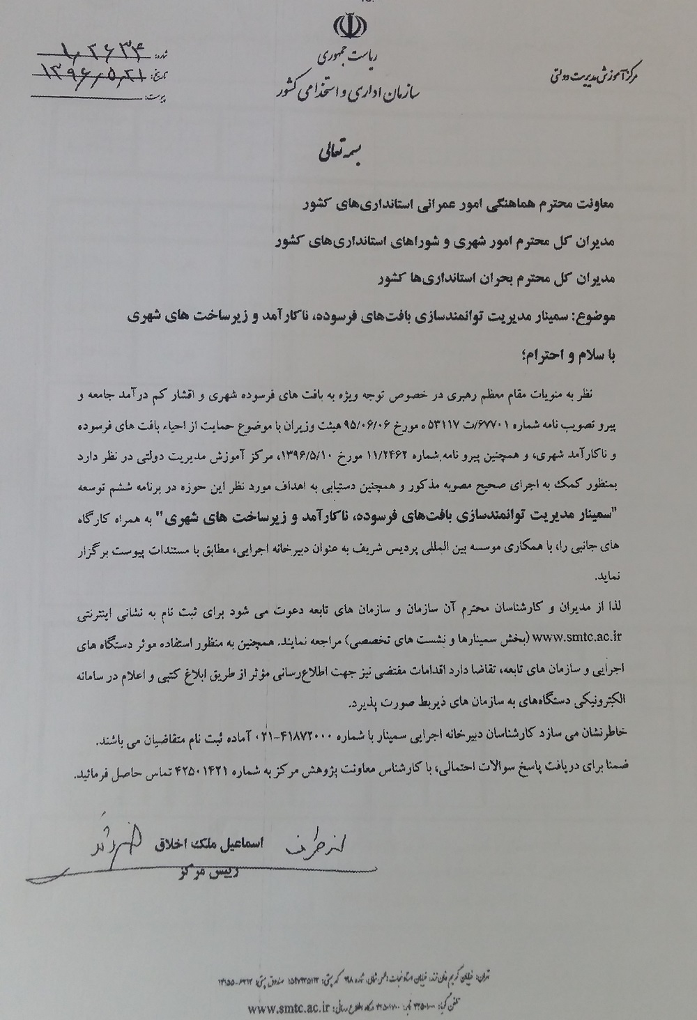 1396/06/08 09:19 تعداد بازدید:2386 سمینار مدیریت توانمندسازی بافت های فرسوده، ناکارآمد و زیر ساخت های شهری نویسنده : روابط عمومی