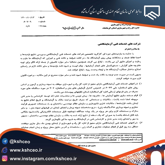 1400/12/03 14:40 تعداد بازدید:956 نامه مدیر کل راه و شهرسازی استان در خصوص رعایت ضوابط و نکات فنی و اجرایی آزمایشگاههای ژئو تکنیک با استفاده از نتایج بازدیدهای دوره ای کارگروه تخصصی شرکتهای خدمات فنی آزمایشگاهی نویسنده : روابط عمومی