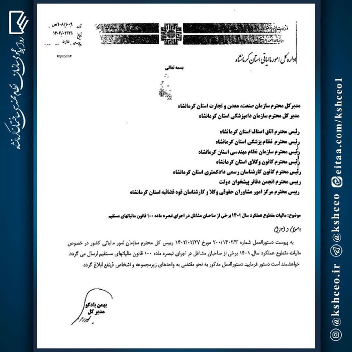 1402/03/06 14:26 تعداد بازدید:609 مکاتبه مدیرکل اداره مالیاتی استان در رابطه با دستورالعمل مقطوع عملکرد سال ۱۴۰۱ برخی از صاحبان مشاغل در اجرای تبصره ماده ۱۰۰ قانون مالیاتهای مستقیم نویسنده : روابط عمومی