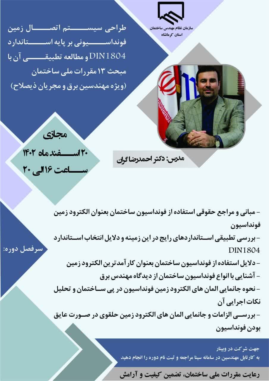 وبینار طراحی سیستم اتصال زمین فونداسیونی بر پایه استاندارد DIN1804 و مطالعه تطبیقی آن با مبحث ۱۳ مقررات ملی ساختمان