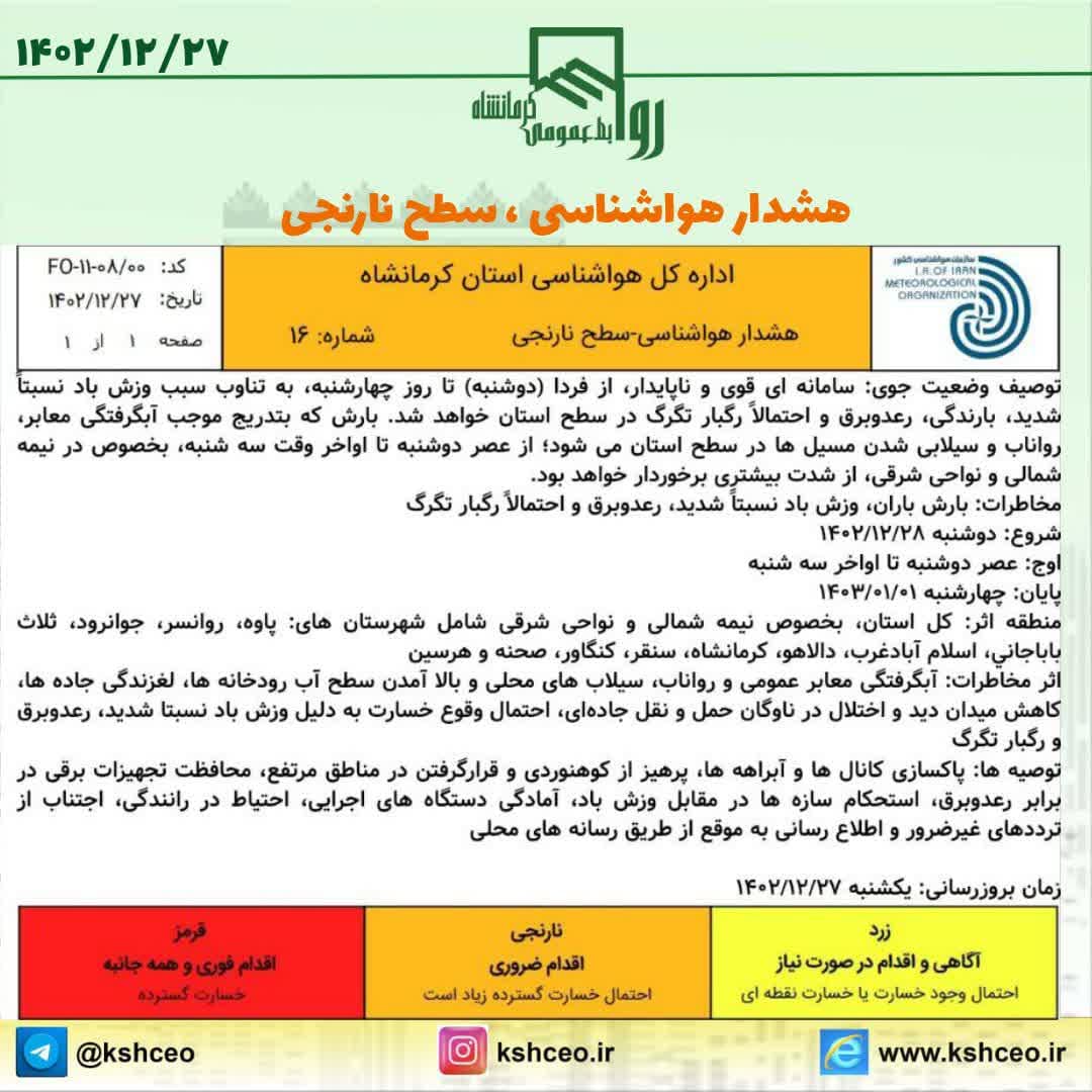 هشدار هواشناسی سطح نارنجی 1402/12/27