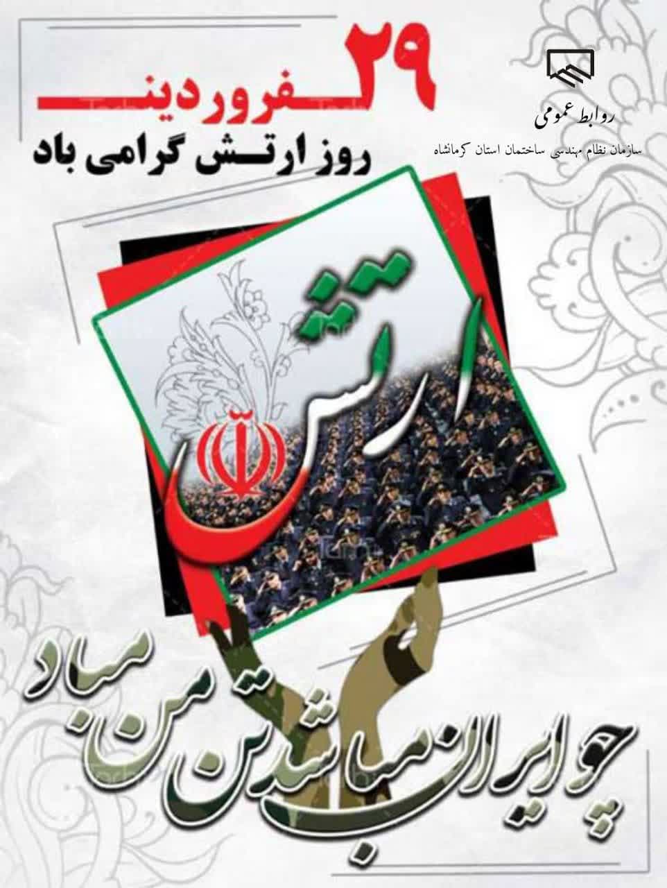 فرا رسیدن ۲۹ فروردین ماه روز ارتش جمهوری اسلامی ایران و یادمان حماسهسازی و ایمان و دلاوری سربازان این آب و خاک ، گرامی باد.