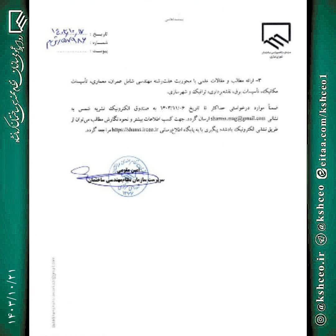 مکاتبه سرپرست سازمان نظام مهندسی ساختمان کشور با موضوع انتشار شماره ۱۲۶ نشریه شمس سازمان نظام مهندسی ساختمان