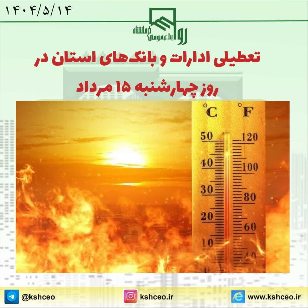 مطابق اعلام استانداری استان و به پیشنهاد کمیته مدیریت انرژی استان و موافقت استاندار کرمانشاه، با هدف کمک به پایداری شبکه و کاهش قطعی برق مشترکان خانگی، تجاری و بخش تولید، فردا چهارشنبه ۱۵ مرداد ۱۴۰۴، همه ادارات و دستگاه های اجرایی و بانکهای استان به جز دستگاههای خدمات رسان و امدادی تعطیل خواهند بود.