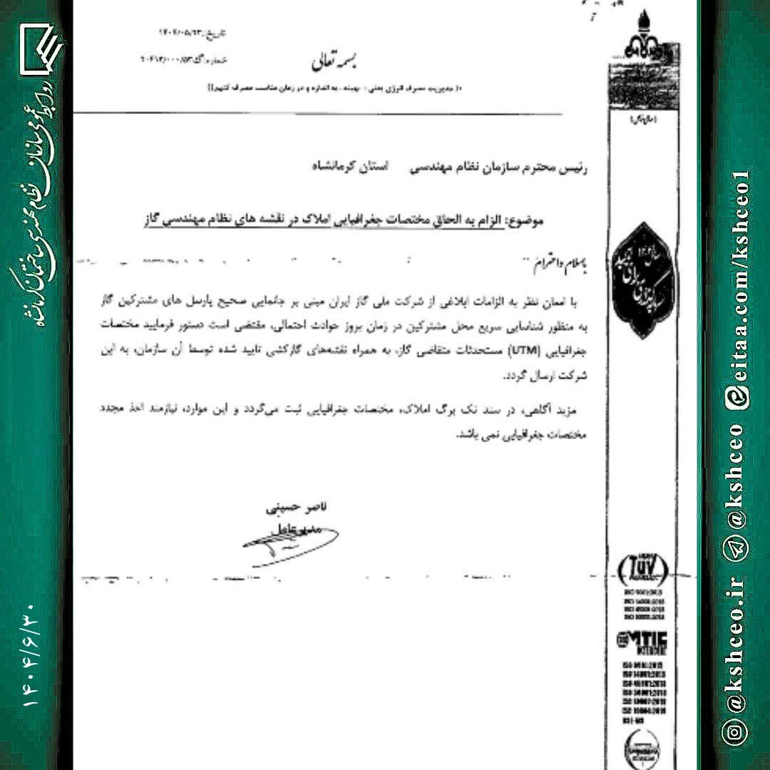 مکاتبه مدیرعامل شرکت ملی گاز استان کرمانشاه با موضوع الزام به الحاق مختصات جغرافیایی ( Utm ) املاک در نقشه های گازکشی تایید شده