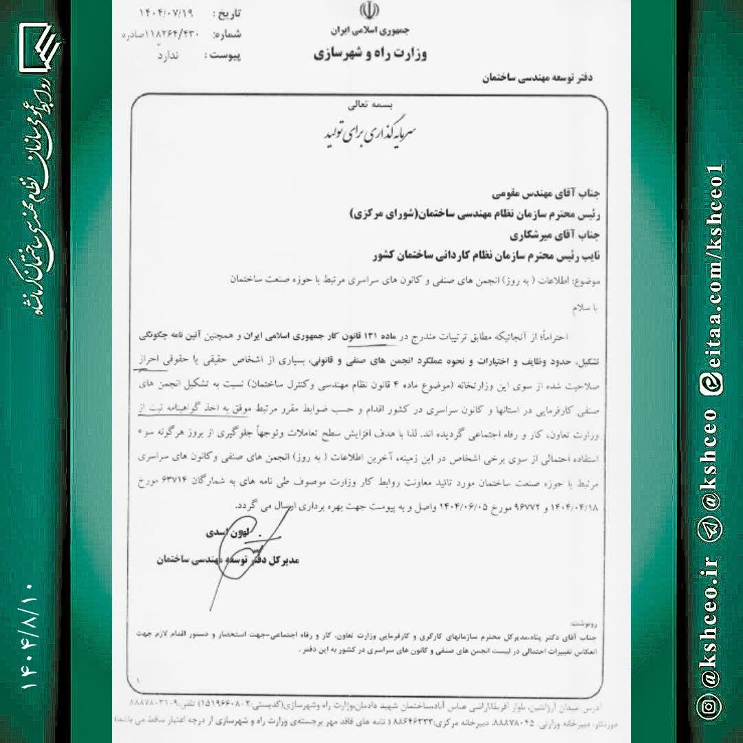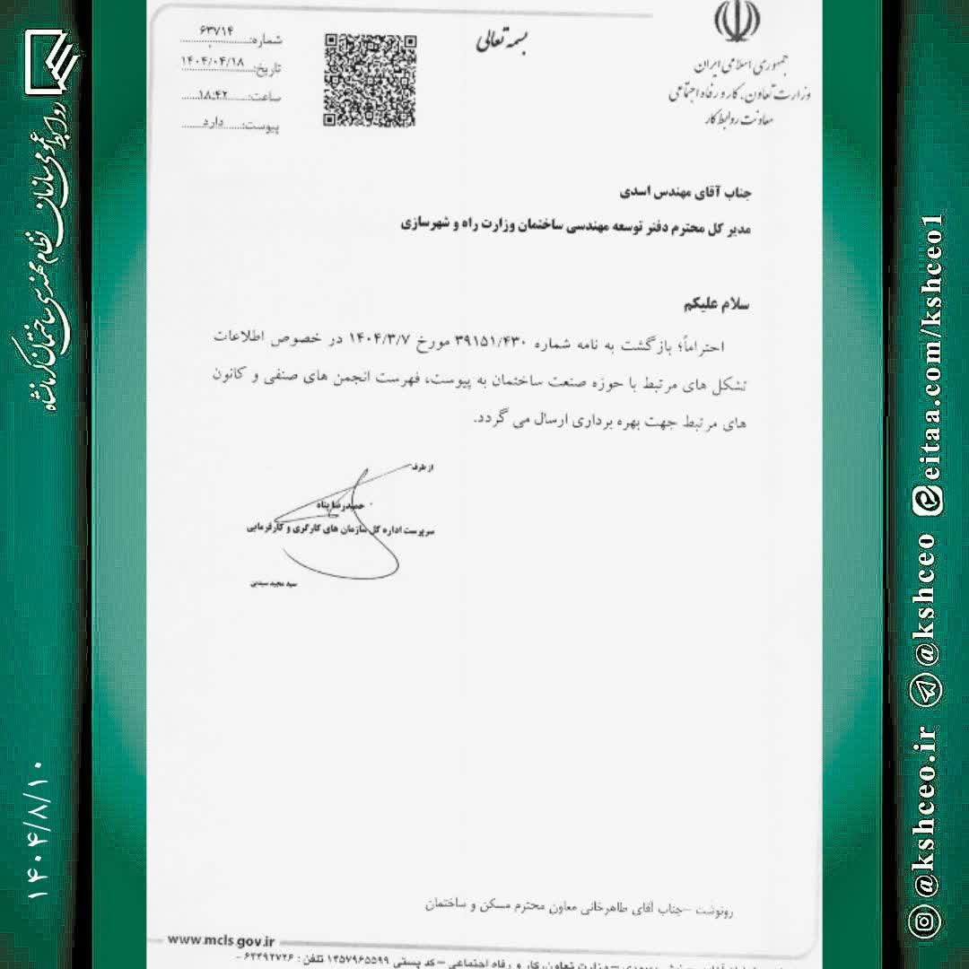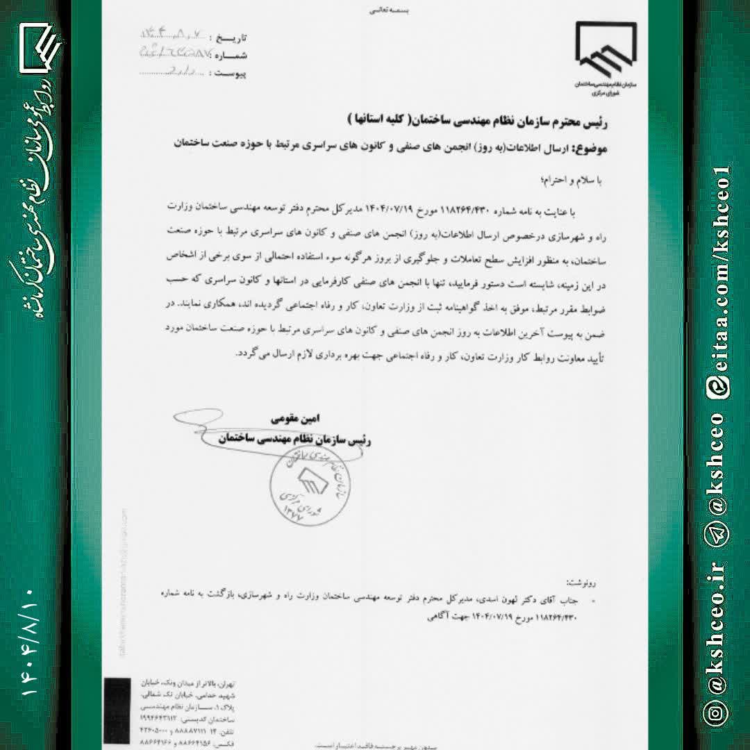 مکاتبه رئیس سازمان نظام مهندسی ساختمان کشور با موضوع ارسال اطلاعات ( به روز ) انجمن های صنفی و کانون های سراسری مرتبط با حوزه صنعت ساختمان