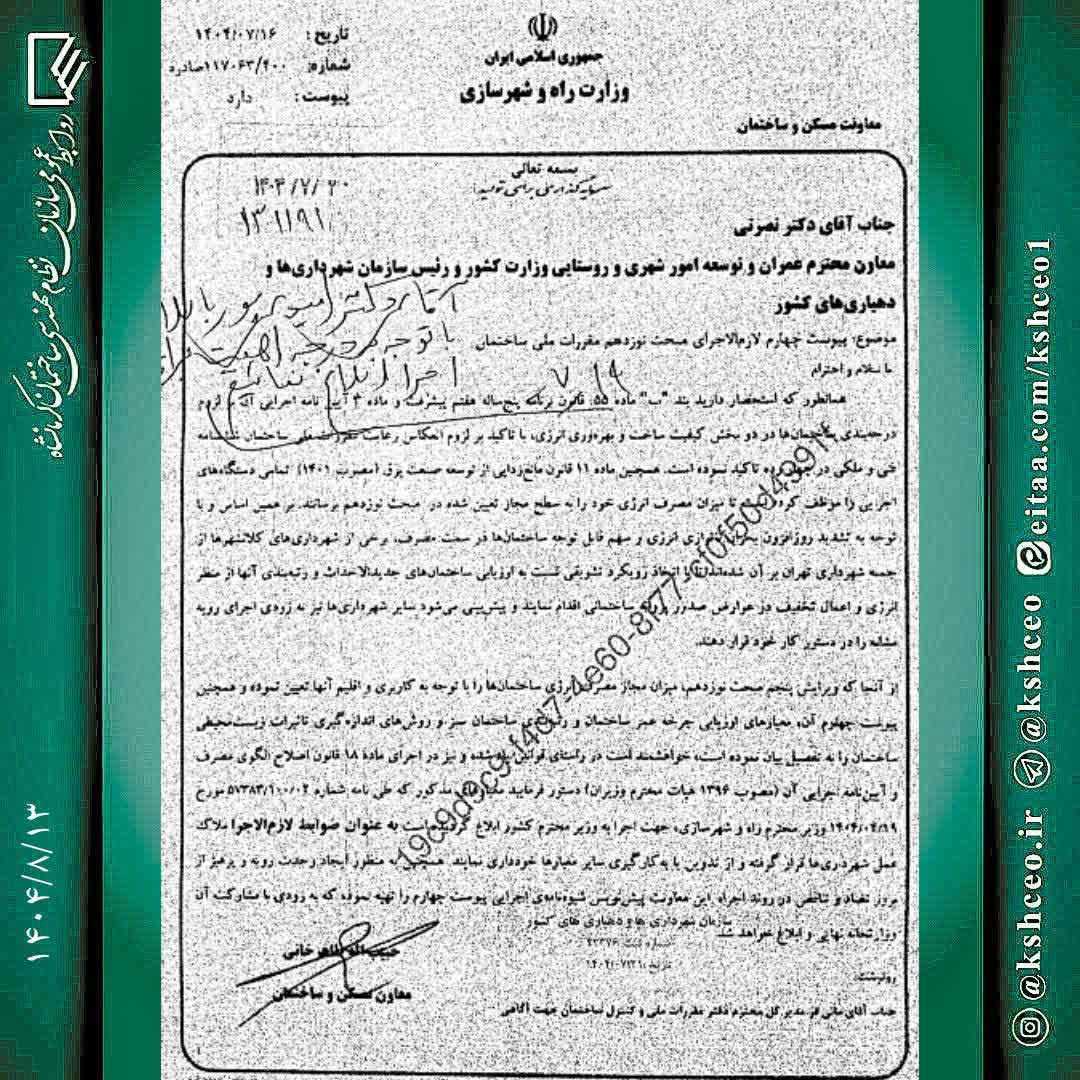 مکاتبه معاونت مسکن و ساختمان وزارت راه و شهرسازی با عنوان ابلاغ پیوست چهارم و الزامی مبحث نوزدهم ( معیارهای ارزیابی و رتبه بندی ساختمان سبز )