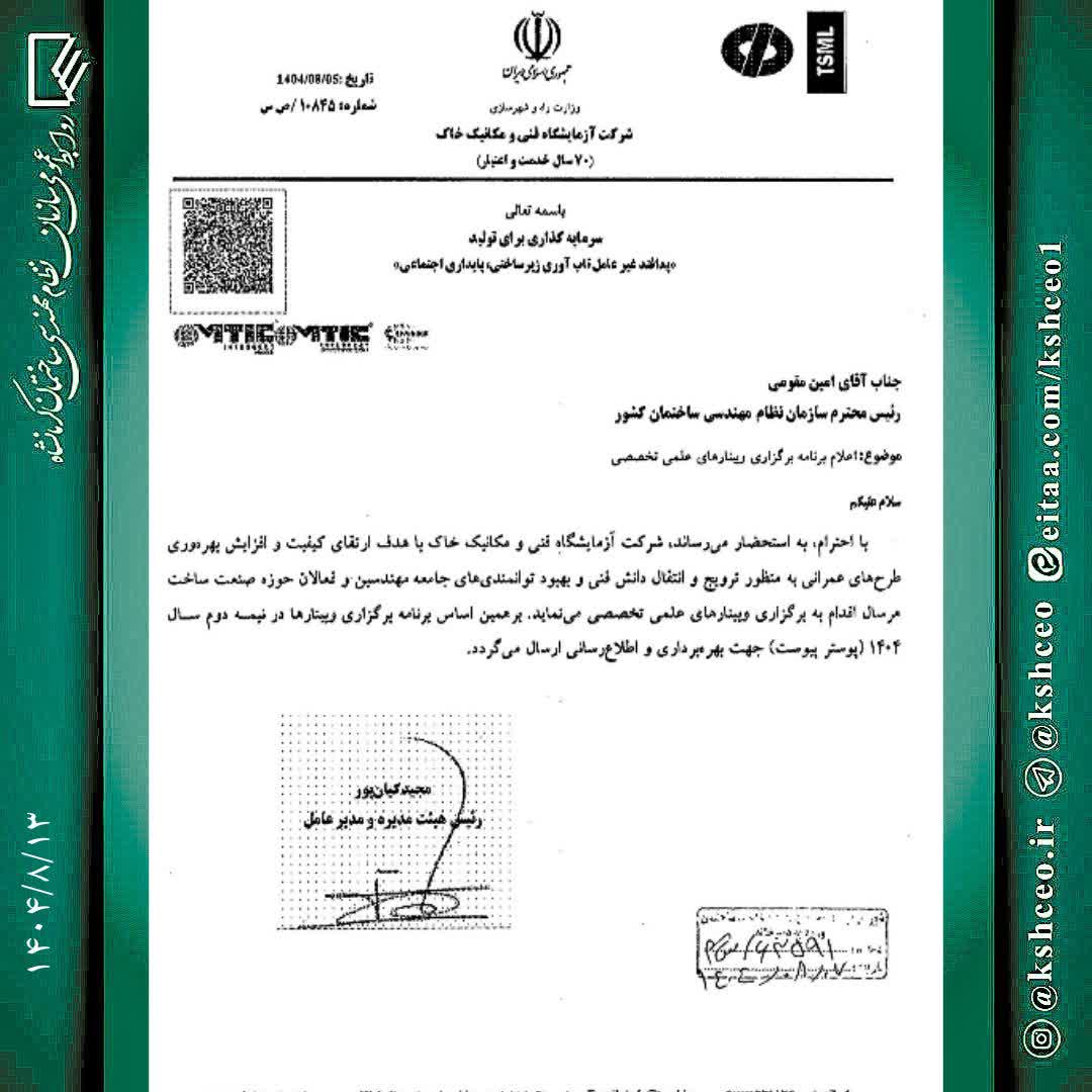 مکاتبه رئیس سازمان نظام مهندسی ساختمان کشور با موضوع اطلاع رسانی وبینارهای تخصصی شرکت آزمایشگاه فنی و مکانیک خاک
