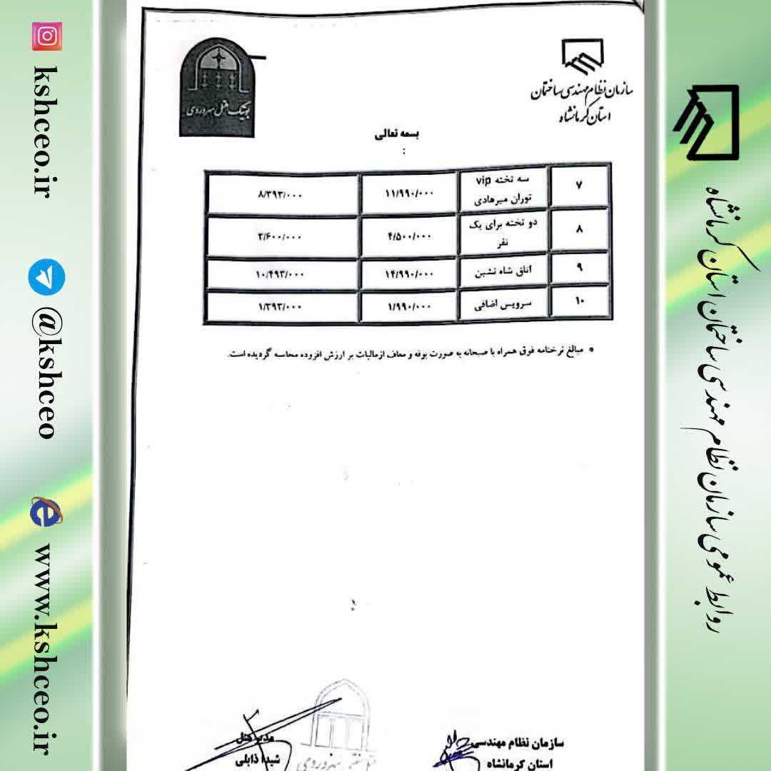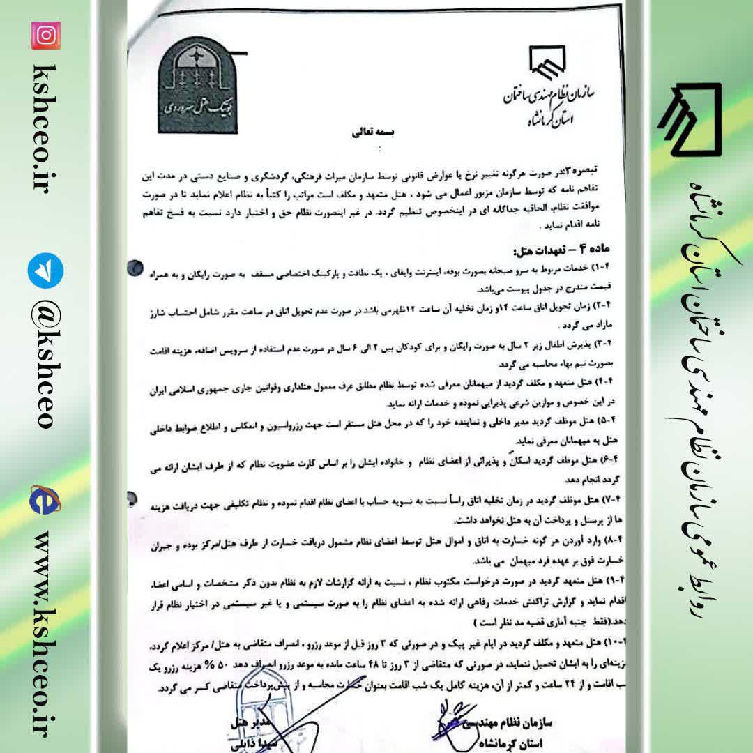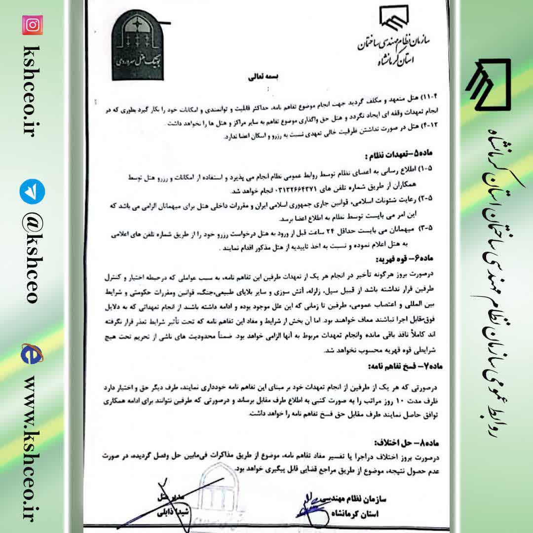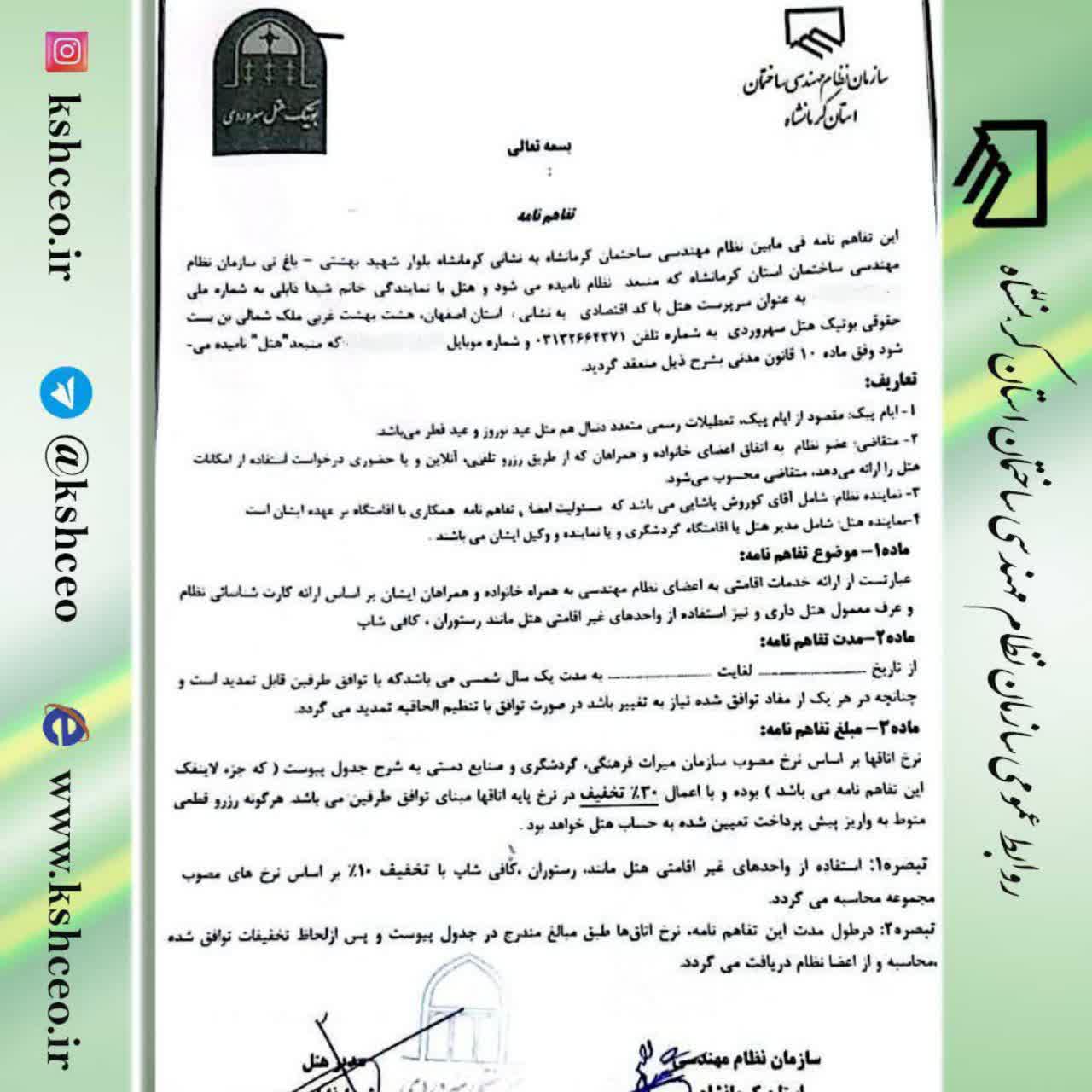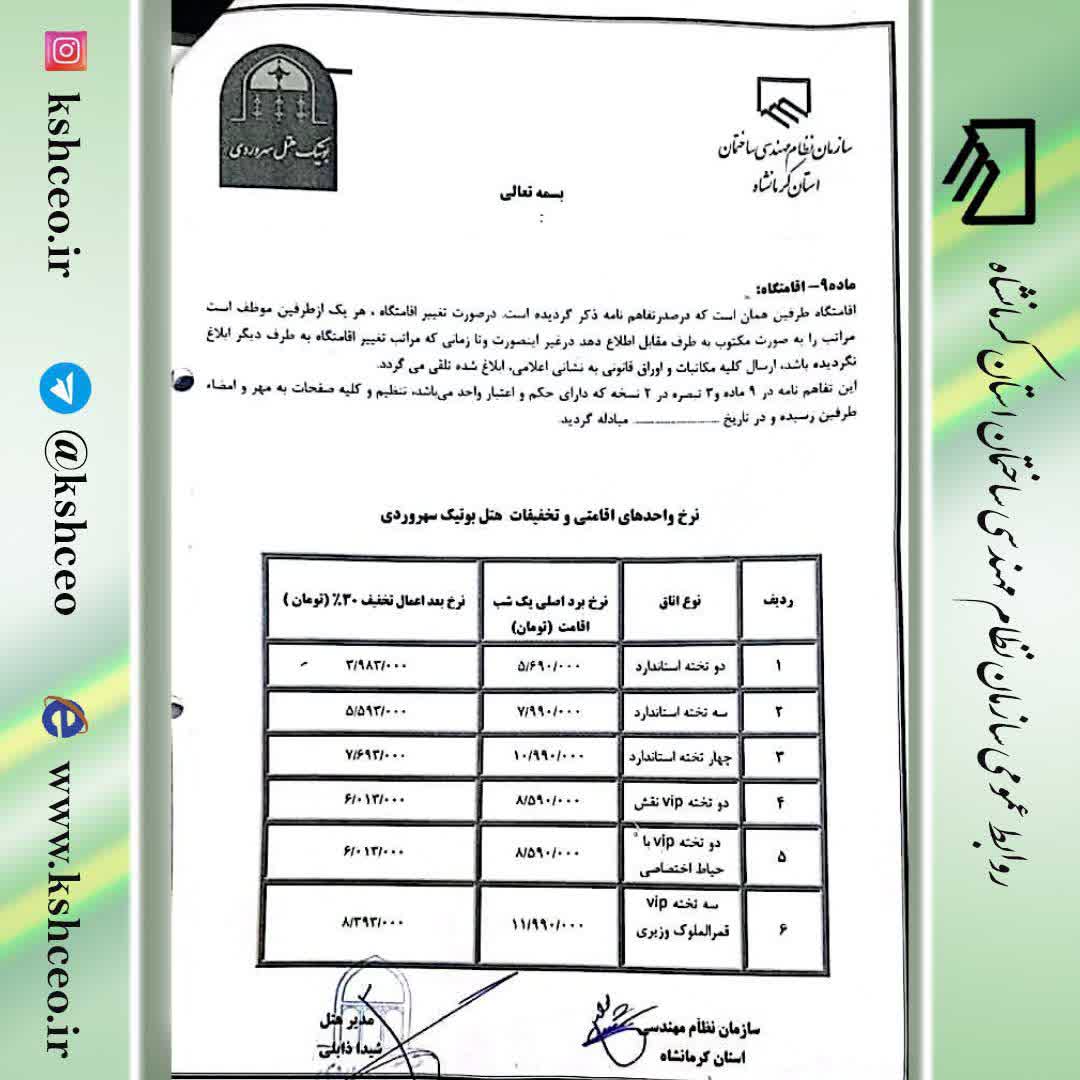 به اطلاع اعضای محترم سازمان نظام مهندسی ساختمان استان کرمانشاه میرساند، در راستای ارتقاء خدمات رفاهی و تسهیل در سفرهای استانی و با همت کمیسیون رفاهی سازمان ، تفاهمنامه همکاری با هتل بوتیک سپهری اصفهان منعقد گردید.