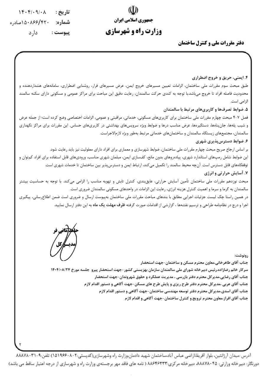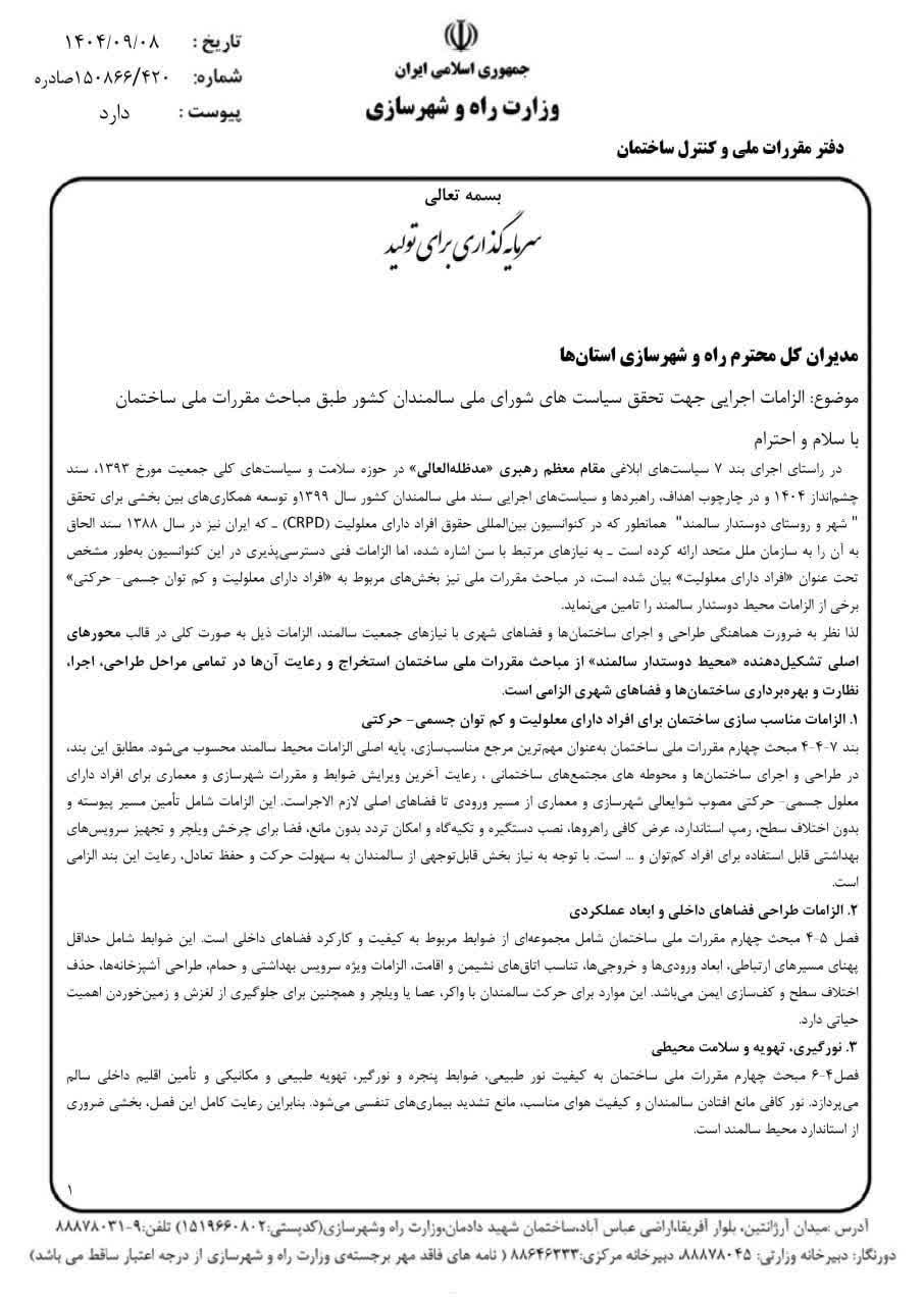مکاتبه مدیرکل دفتر مقررات ملی و کنترل ساختمان با موضوع الزامات اجرایی جهت تحقق سیاست های شورای ملی سالمندان کشور طبق مباحث مقررات ملی ساختمان