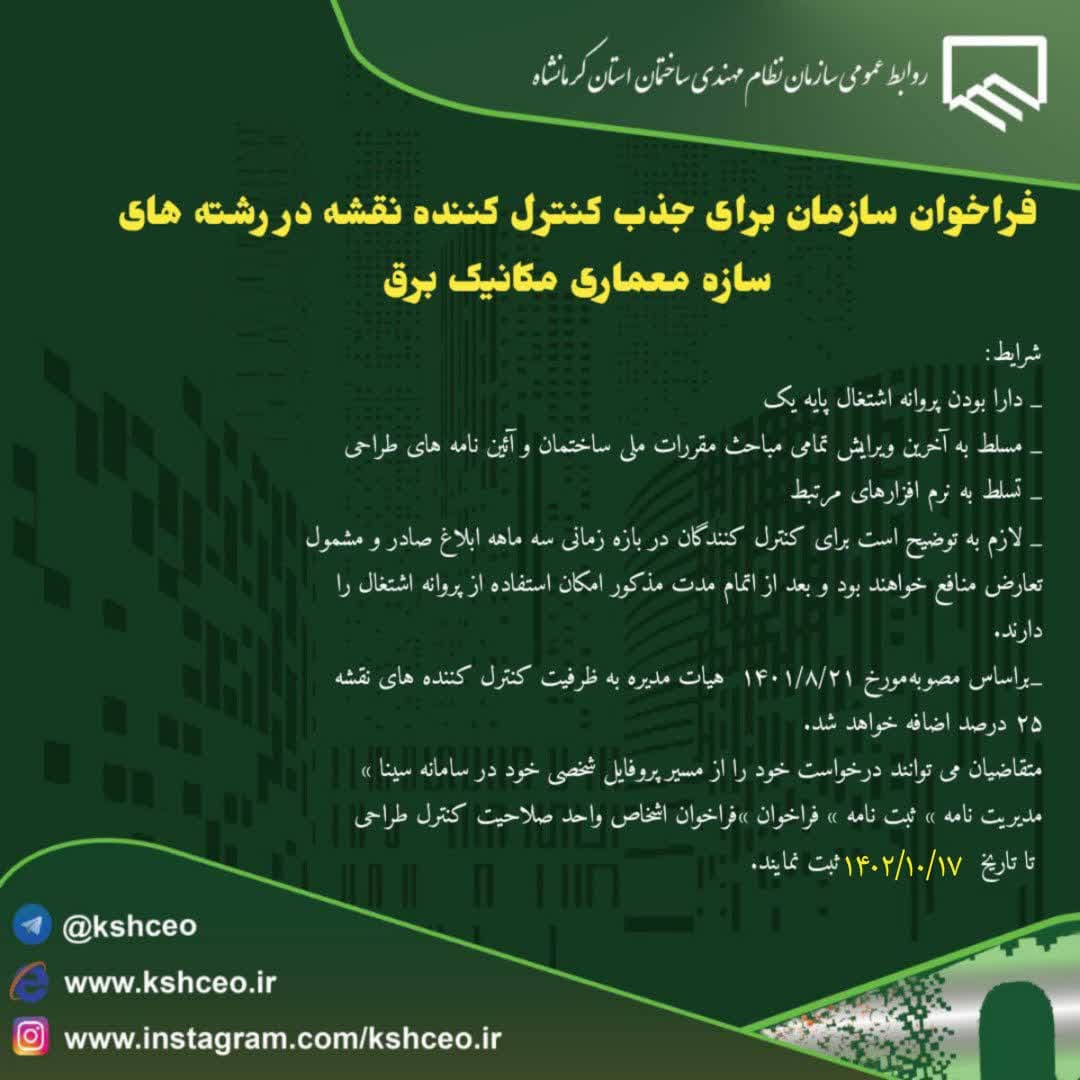 فراخوان سازمان برای جذب کنترل کننده نقشه در رشته های سازه ، مکانیک برق
